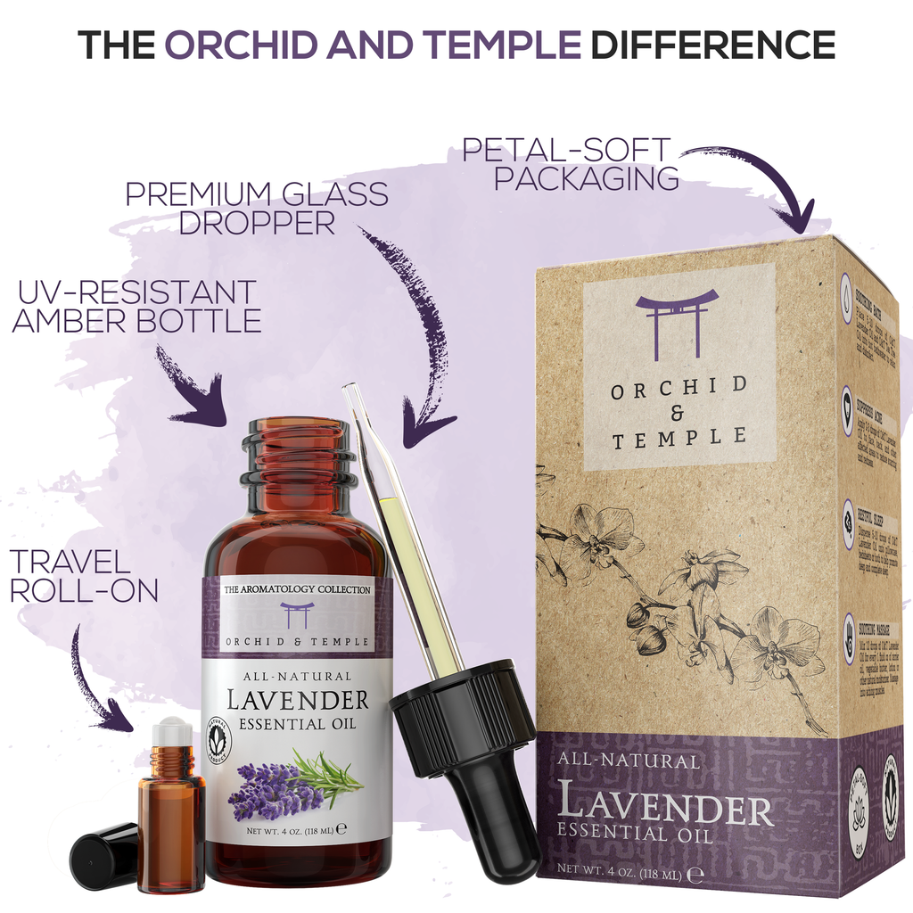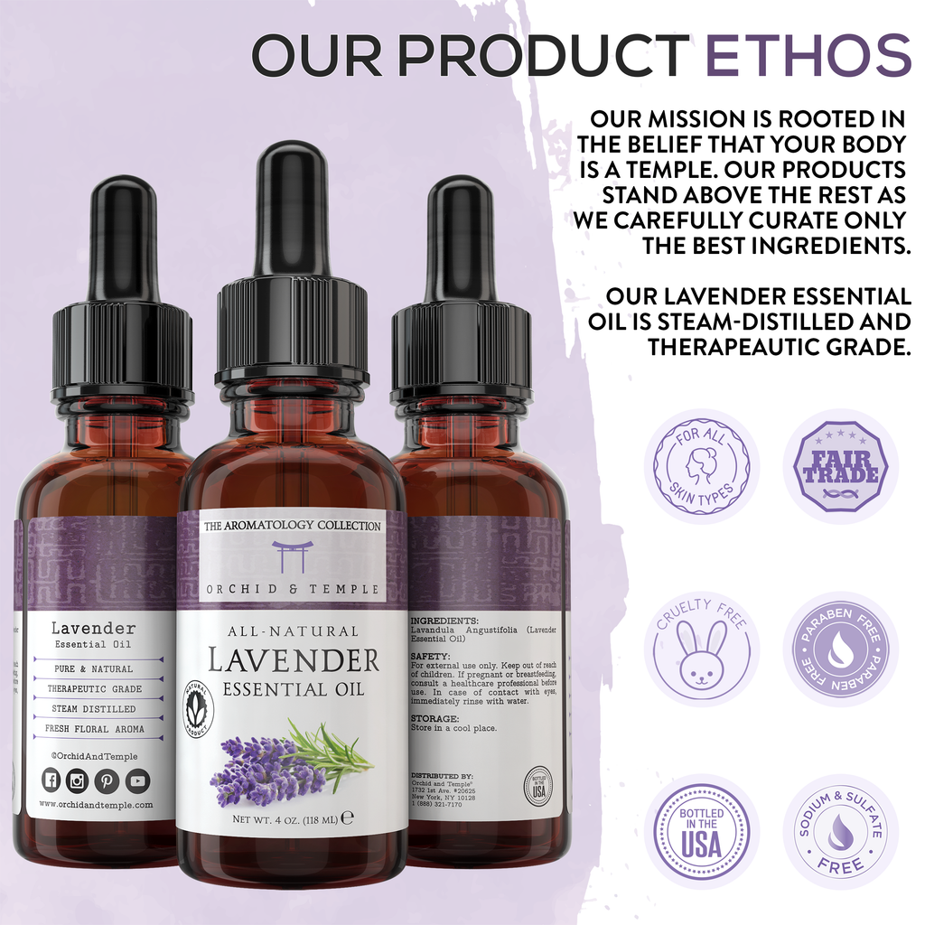 Our Lavender Essential Oil is 100% pure and all-natural. This set is designed for the ultimate soothing bath experience! Use the included dropper to add three to 12 drops of our lavender essential oil in a tablespoon (15 ml) of carrier oil to create a very aromatic, therapeutic bath!